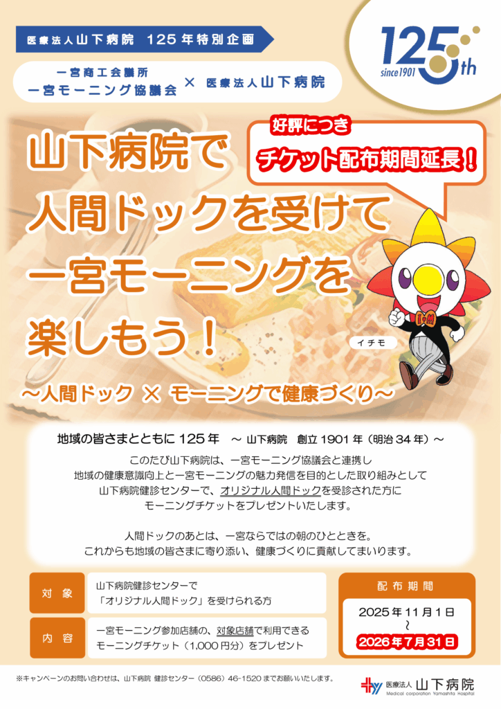 【125年特別企画】モーニングチケット配布期間延長のお知らせ (一宮商工会議所 一宮モーニング協議会 × 医療法人山下病院 共同キャンペーン 「山下病院で人間ドックを受けて一宮モーニングを楽しもう!」)