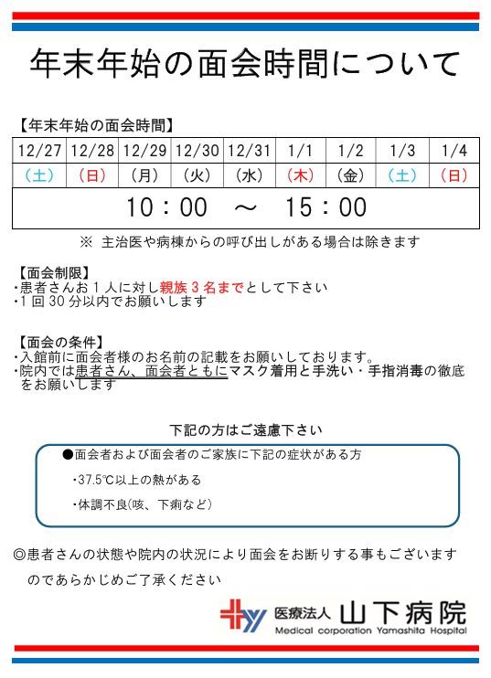 年末年始における入院患者様への面会ですが、以下の通りとさせていただきます。