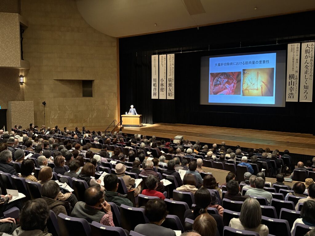 手術前から体力や筋力を高める「プレハビリテーション」の重要性について解説され、適切な運動や栄養管理によって術後の合併症リスクの低減や回復の促進につながることが紹介されました。また、腸内細菌と健康との関係にも触れ、腸内環境を整えることが免疫機能の維持や術後の回復に役立つ可能性があることを説明。日常生活で取り入れやすい運動や食事のポイントについても、分かりやすくお話しいただきました。
