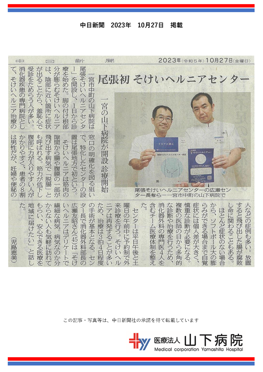 【メディア】当院で10月開設した“尾張そけいヘルニアセンター”が「中日新聞」に掲載されました